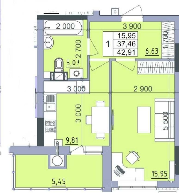 • Загальна площа 43 м2