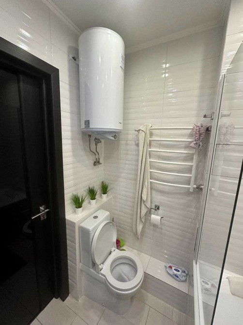Роздільний санвузол оформлений сучасною плиткою "під мармур". Встановлені тропічний душ та підвісний унітаз з інсталяцією.