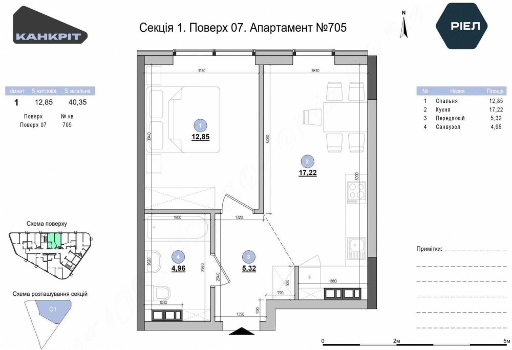 Площа: 40,35 м² – Спальня — 12,85 м² – Кухня-вітальня — 17,22 м² – Передпокій — 5,32 м² – Санвузол — 4,96 м²