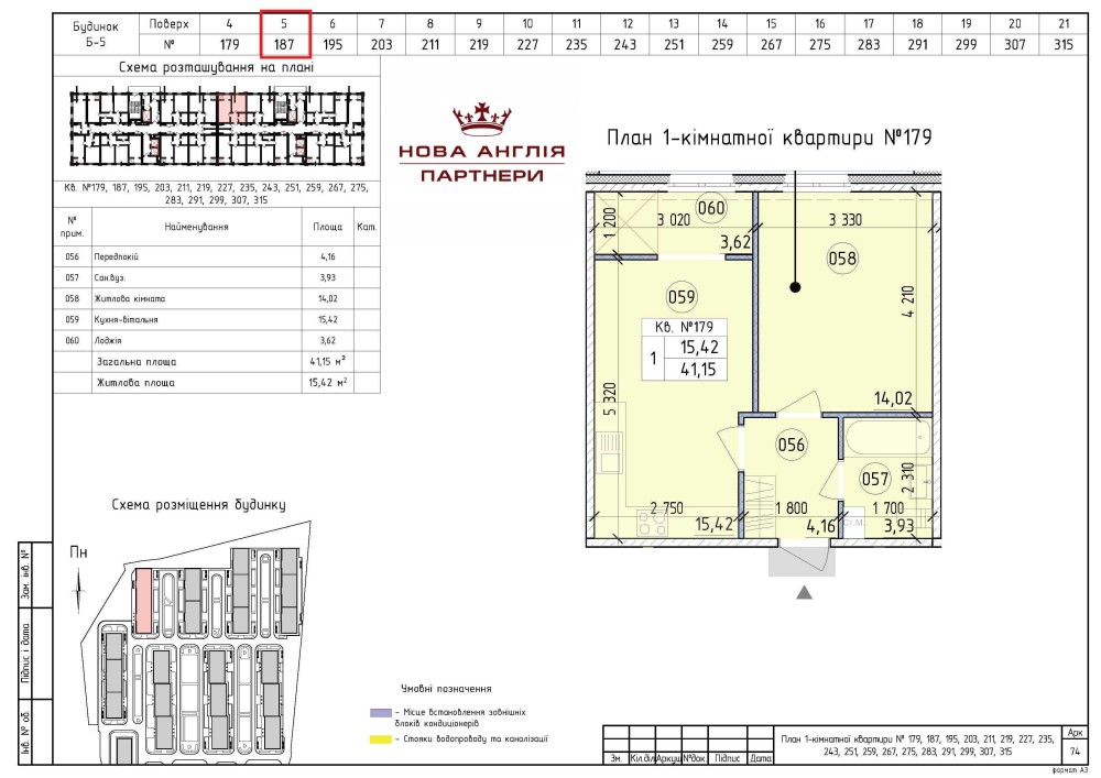 - Квартира № 187 на 5му поверсі. Загальна площа 41,15 кв.м. Вартість 68 000 $ (перепоступка). Вид на місто.