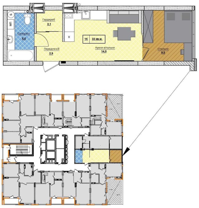 - передпокій 2,5 кв.м. з гардеробом 2,1 кв.м.