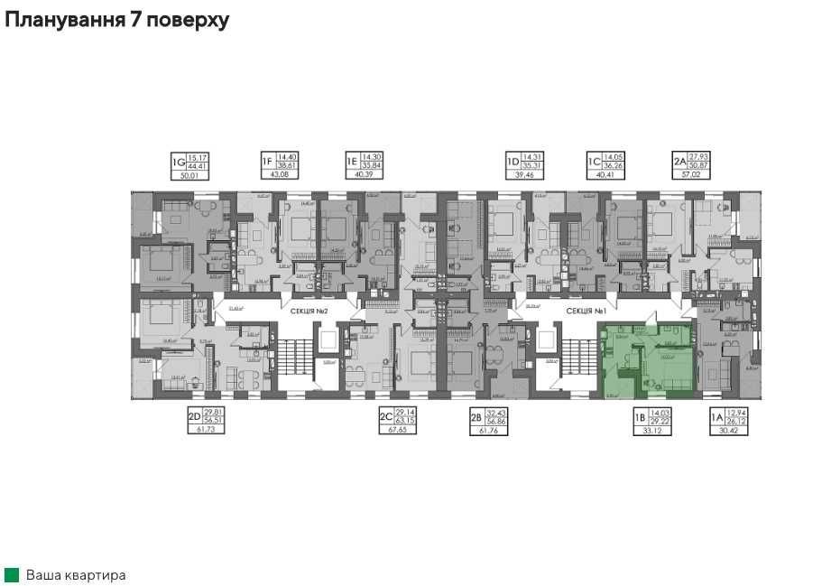 По телефону питайте: 2-й будинок, секція 1, 7-й поверх, квартира № 42, 33,12 м².