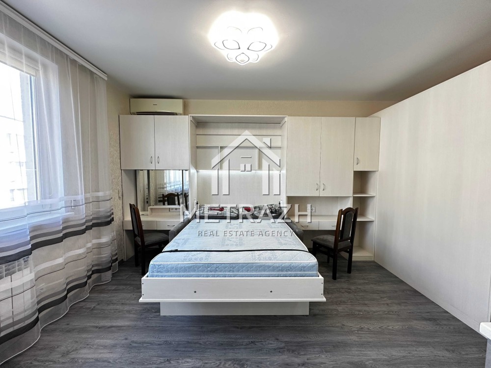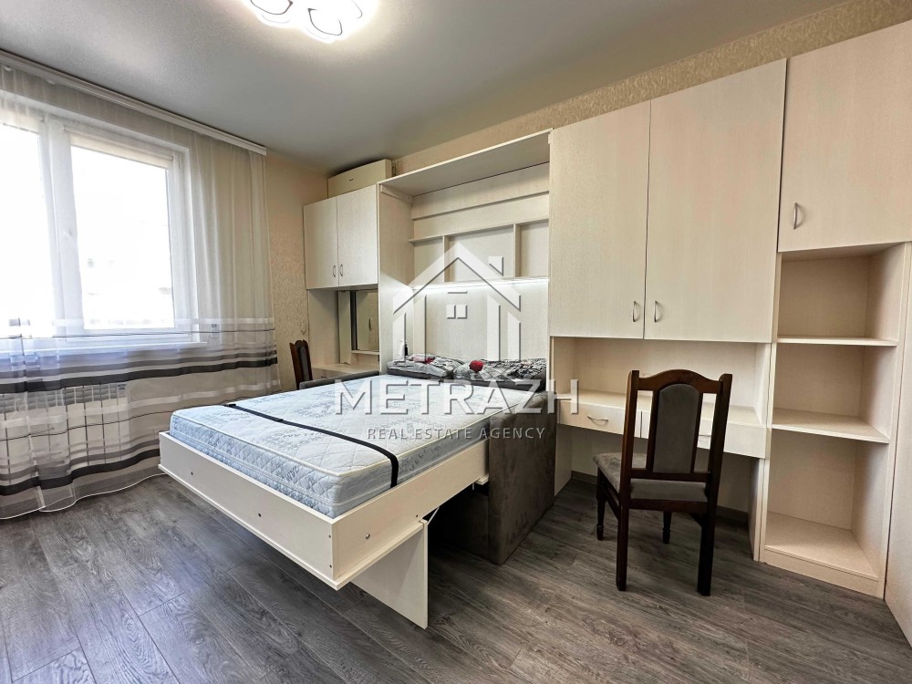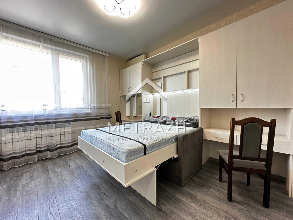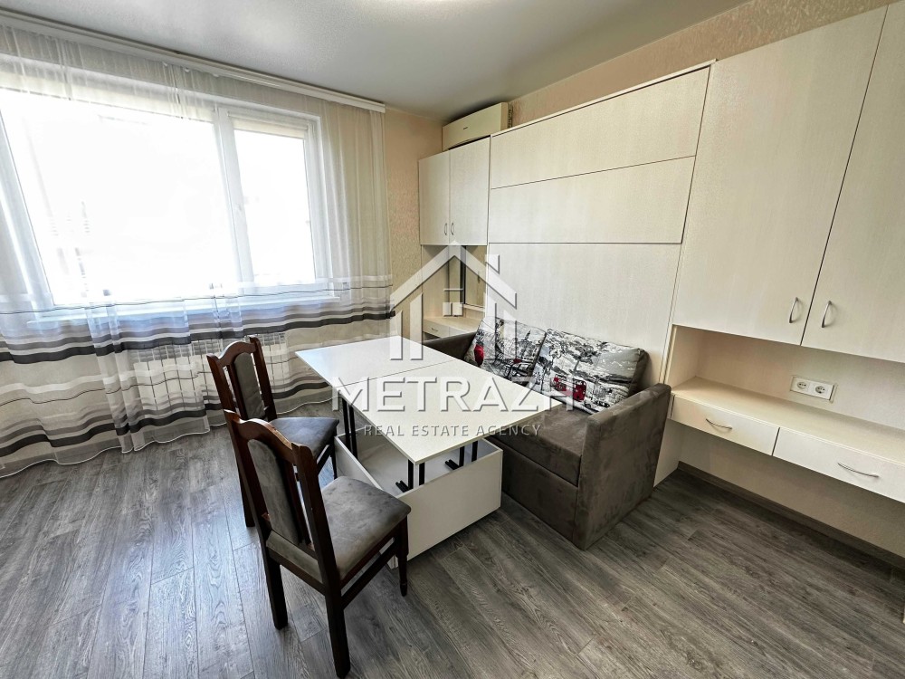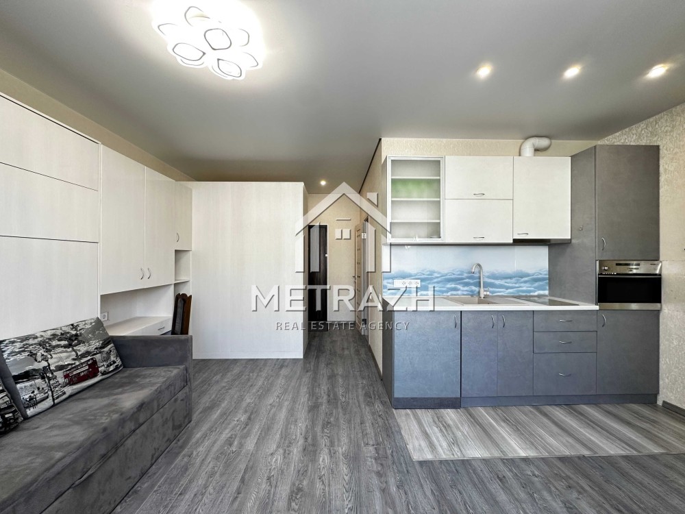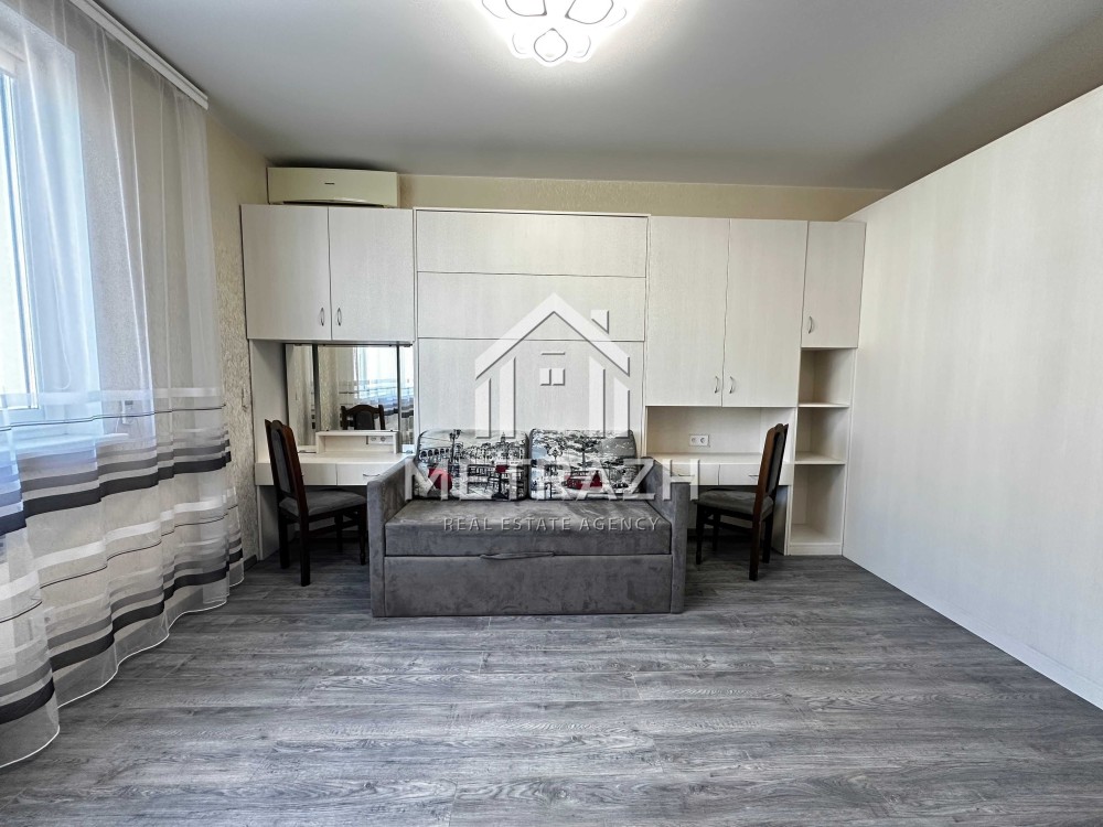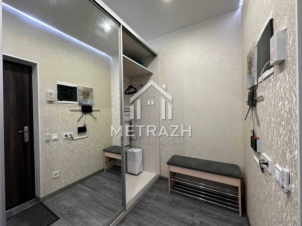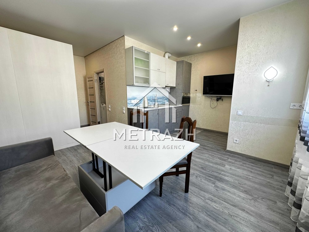 Квартира обладнана якісними меблями, виготовленими на замовлення. Шафа-купе формує окрему зону передпокою, а ліжко-трансформер дозволяє легко змінювати простір від компактного дивана до повноцінного двоспального ліжка. Журнальний столик трансформується у зручний кухонний стіл для чотирьох осіб. Простір організований так, щоб забезпечити максимальну кількість місць для зберігання речей. Є робоча зона, яка також може виконувати функцію туалетного столика.