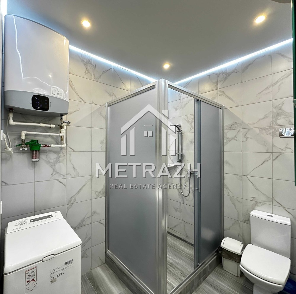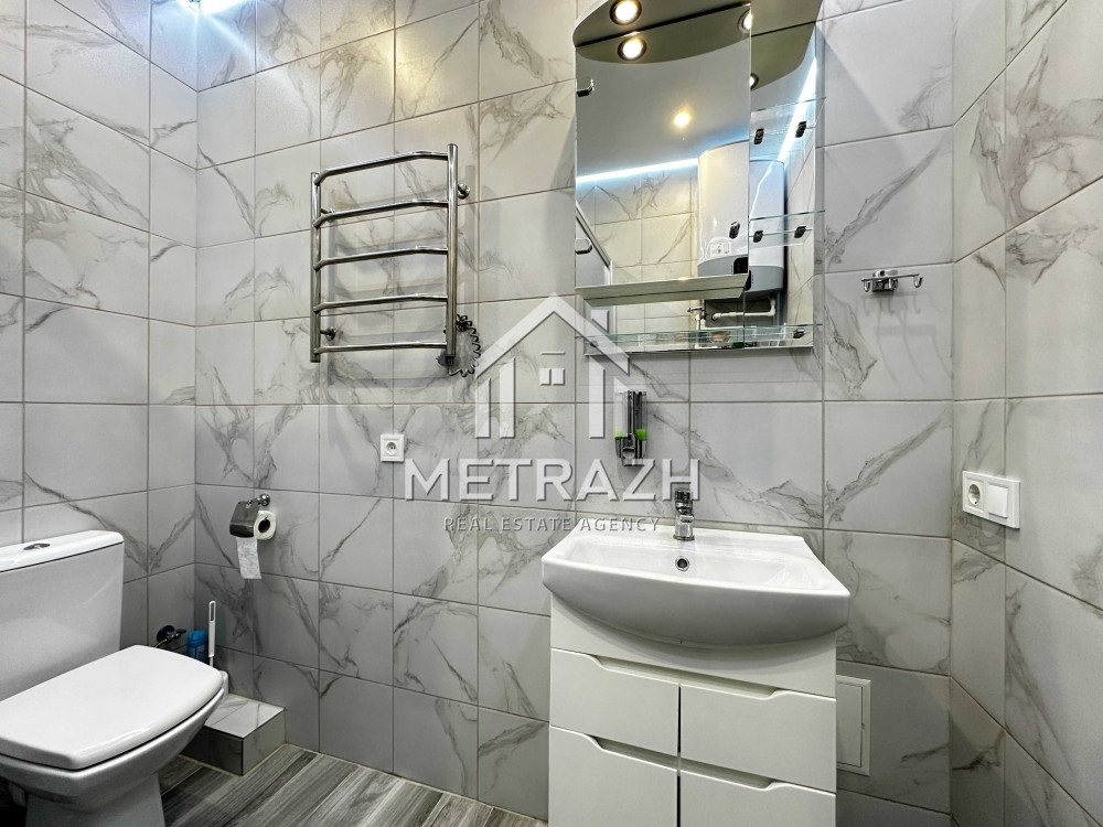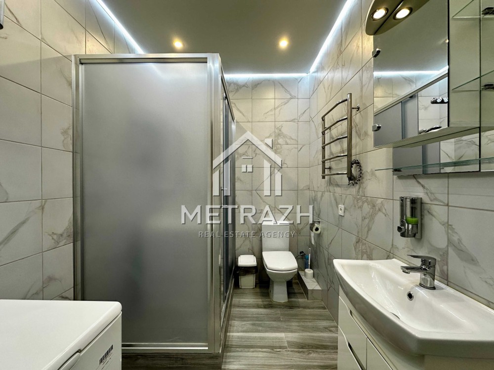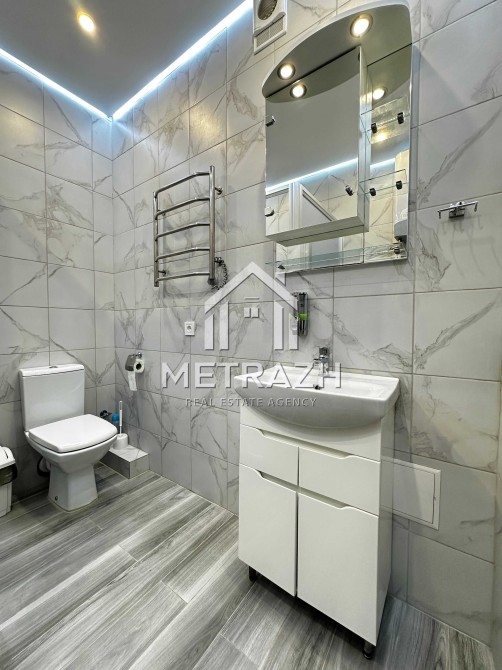 Освітлення продумане до деталей: стельові світильники, підсвітка кухонної зони, освітлення над ліжком. Частина освітлення керується сенсорно, частина — пультами. Встановлено дві зони підігріву підлоги — у санвузлі та на кухні. Є система фільтрації води, що подовжує строк служби всієї сантехніки. Санвузол просторий — 4,8 м².