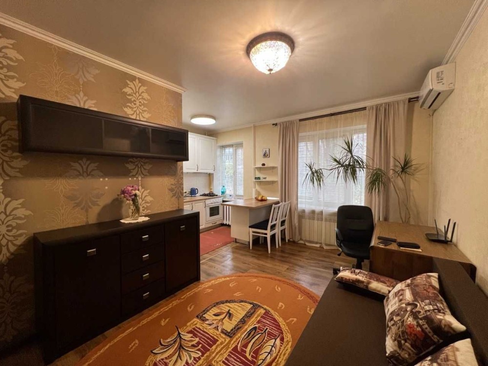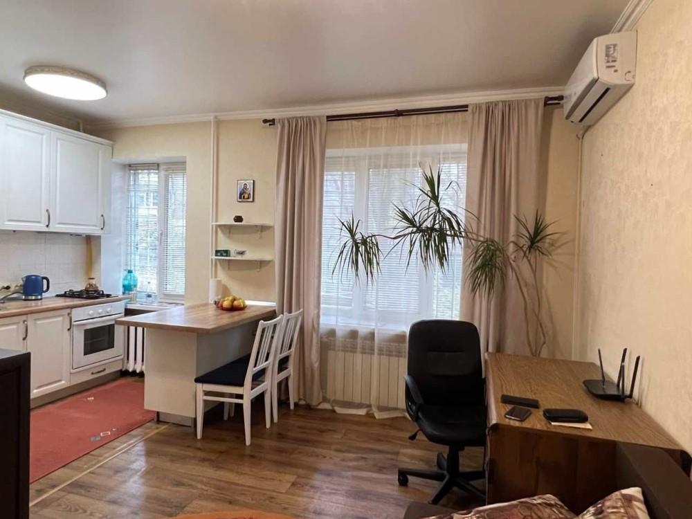 Цегляна хрущівка, поверх перший, є підвал\бомбосховище в квартирі. В квартирі сучасний ремонт в гарному стані, загальна площа квартири 25м2, вбудована кухня, двсопальний диван, шафа, є вся необхідна техніка та меблі.