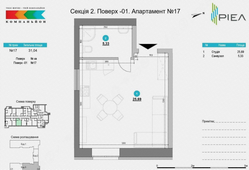 – Студійна зона з кухнею, спальнею та вітальнею — 25,69 м²