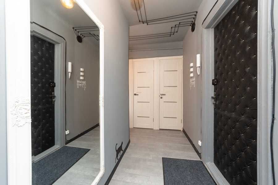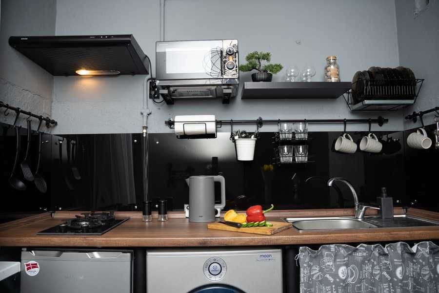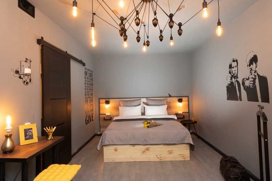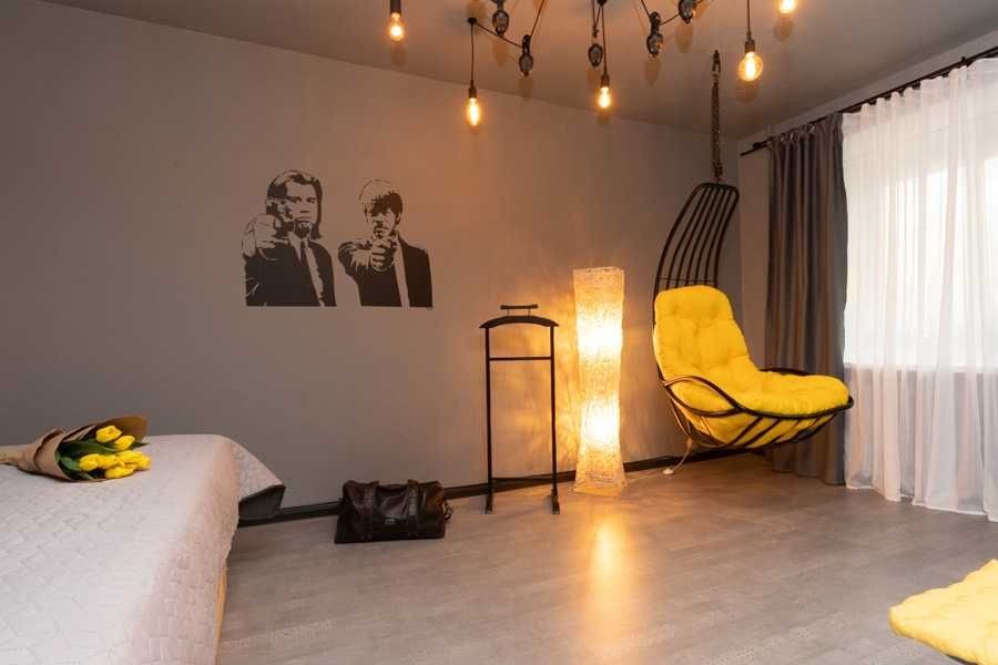 Квартира оформлена в лофтових кольорах, витримана в одній колірній гамі, укомплектована 2 великими двоспальними ліжками з дорогими ортопедичними матрацами, підвісним кріслом-гойдалкою, безліччю цікавих авторських деталей: малюнками на стінах, лампами Едісона, світильниками.