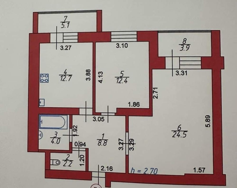 3 раздельные комнаты. Кухня. Раздельный Сан.Узел Т/Ванна.
