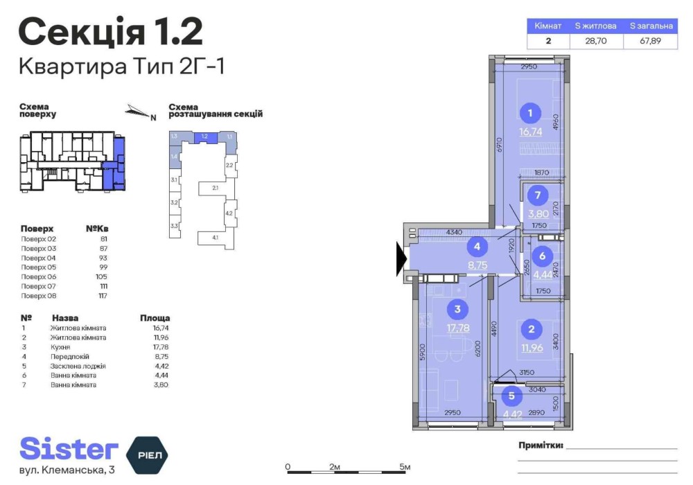 Пропонуємо вам 2-к квартиру площею 68 м² у ЖК Sister, за адресою: вул. Клеманська, 3 — Дарницький район, м. Київ.