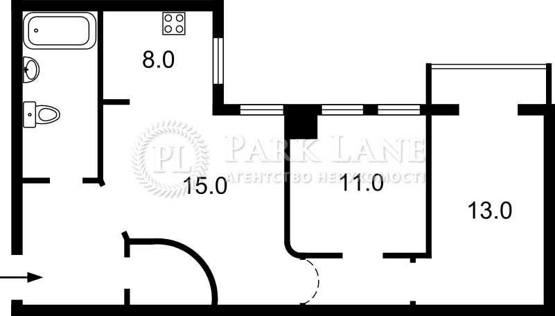 Загальна площа 60 м², 2 спальні, вітальня з кухнею, кладова, суміщений санвузол (ванна), засклений балкон. Вікна виходять у двір.