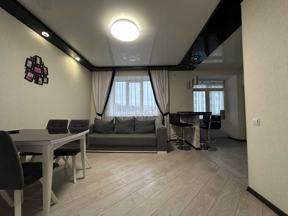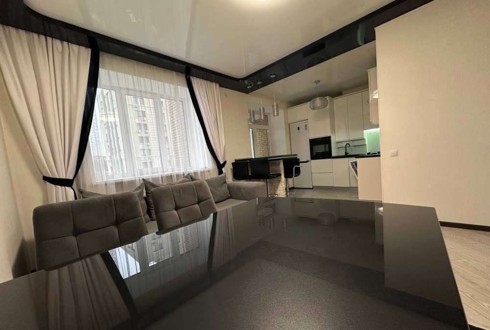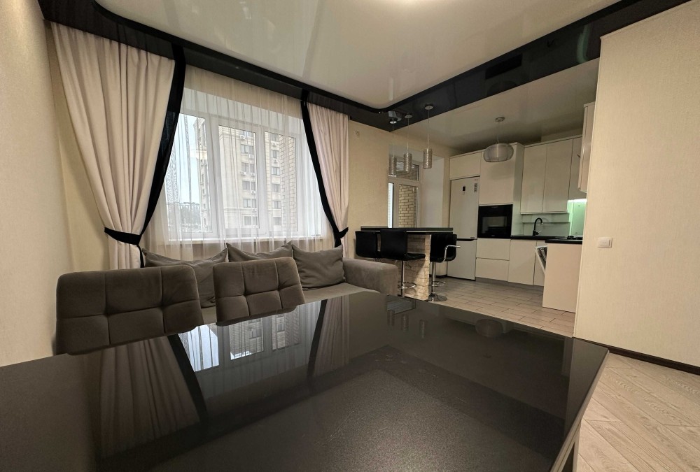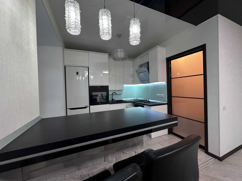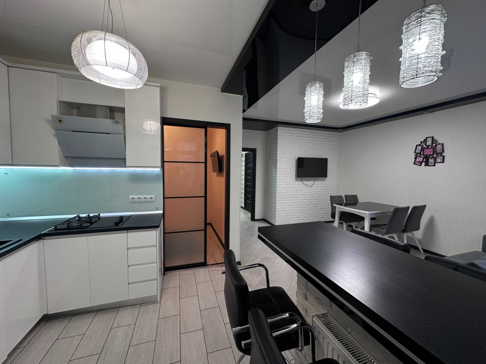 Квартира має велику простору кухню-вітальню, яка є головною зоною для сімейного відпочинку та прийому гостей. Світлий інтер’єр, панорамні вікна та якісний ремонт створюють атмосферу затишку та сучасності. Мебльована вітальня переходить у функціональну кухонну зону з барною стійкою, технікою та достатньою кількістю місця для зберігання.