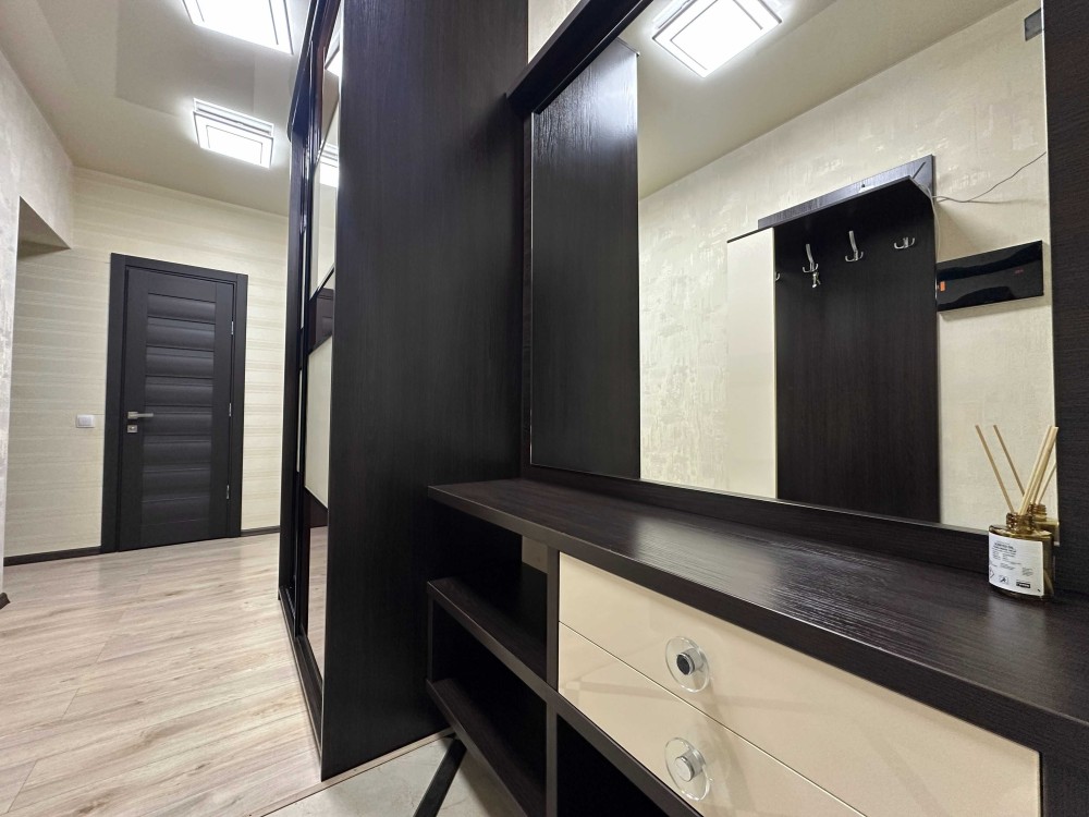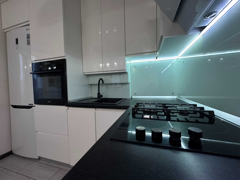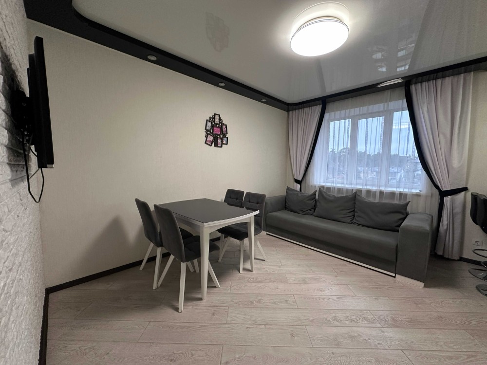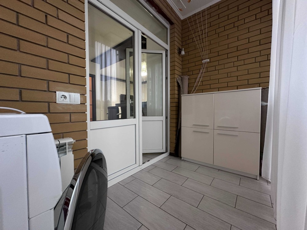 Квартира має велику простору кухню-вітальню, яка є головною зоною для сімейного відпочинку та прийому гостей. Світлий інтер’єр, панорамні вікна та якісний ремонт створюють атмосферу затишку та сучасності. Мебльована вітальня переходить у функціональну кухонну зону з барною стійкою, технікою та достатньою кількістю місця для зберігання.