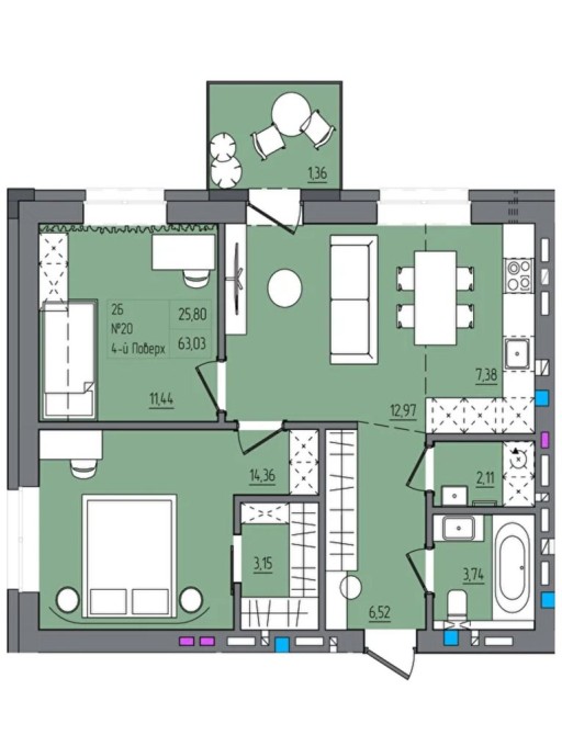 • Загальна площа 63.01 м2