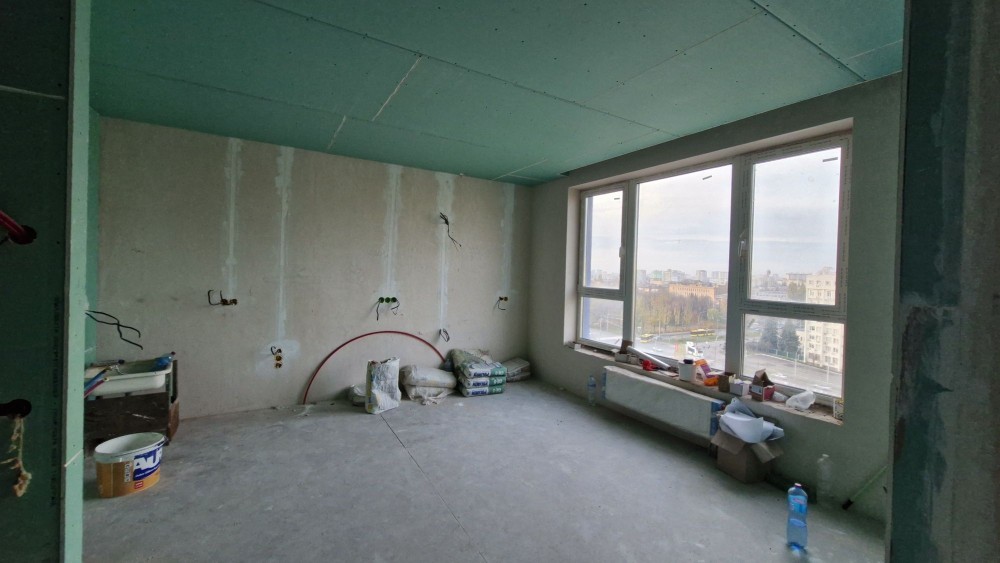 Панорамні вікна в дві сторони: на майбутній торговий центр і у внутрішній двір.