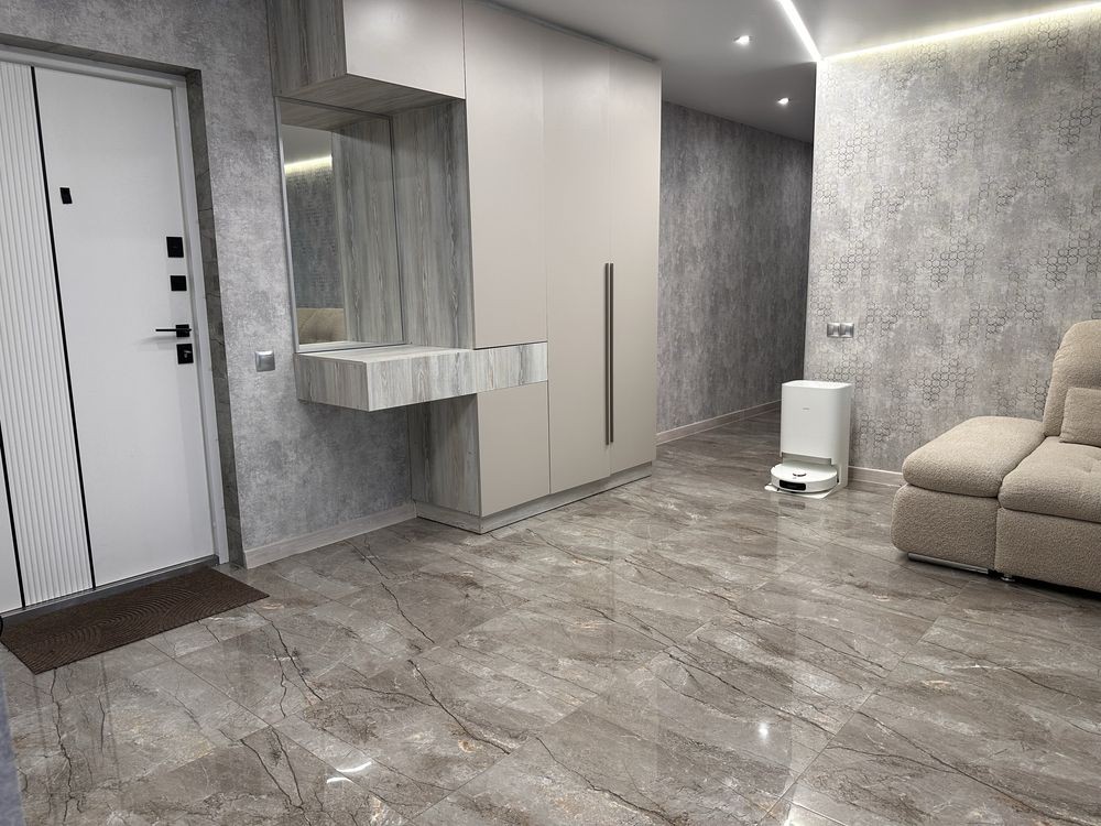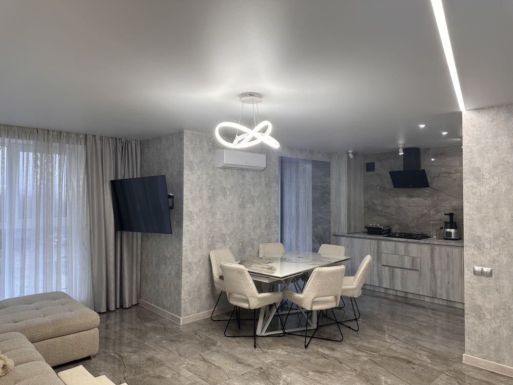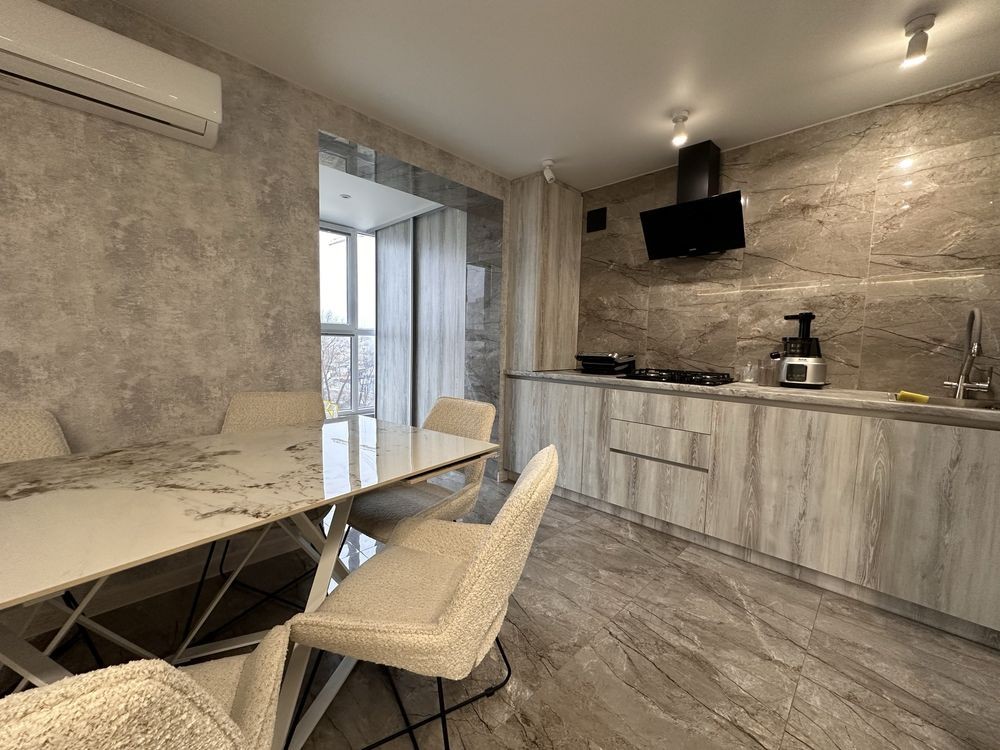 Квартира знаходиться на 5-му поверсі в 10 поверховому будинку,повністю укомплектована з великими панорамними вікнами та з ремонтом хорошої якості.