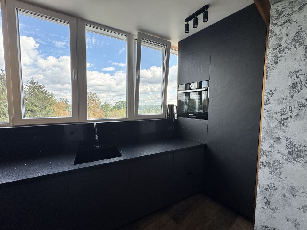 • сучасна кухня з панорамним видом, укомплектована всією необхідною технікою (духова шафа, мікрохвильова піч, посудомийна машина Bosch, газова варильна поверхня);