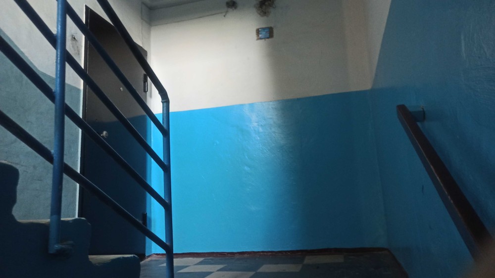 Первый высокий этаж, решетки на окнах, железная дверь.