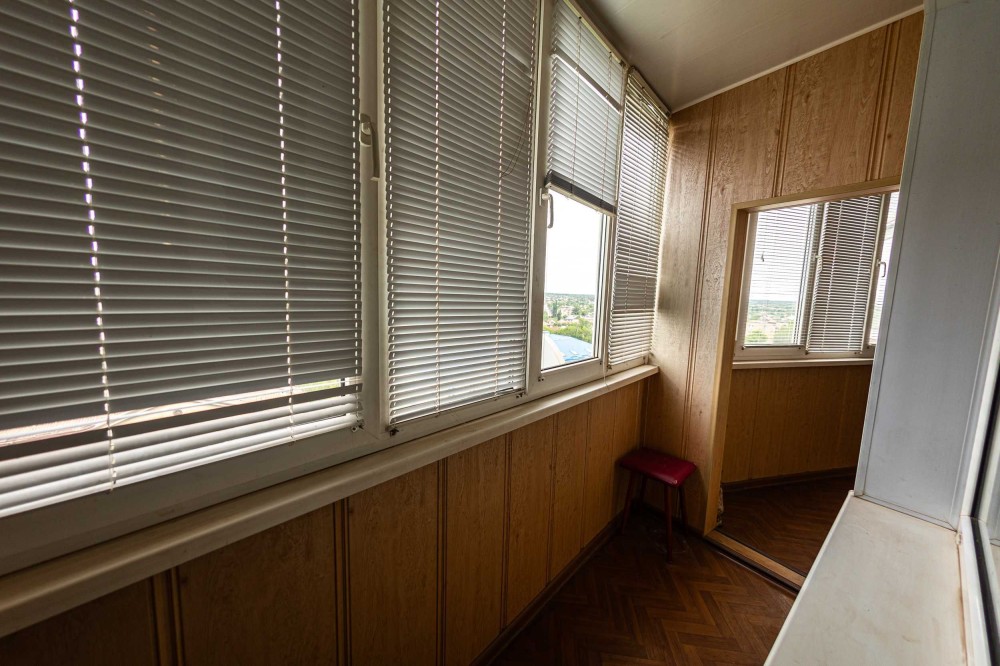 Планування: три окремі кімнати, кухня збільшена: об’єднана з коридором та передпокоєм. Велика лоджія (вздовж всієї квартири) виходить на проспект та має два виходи: з зали та спальні