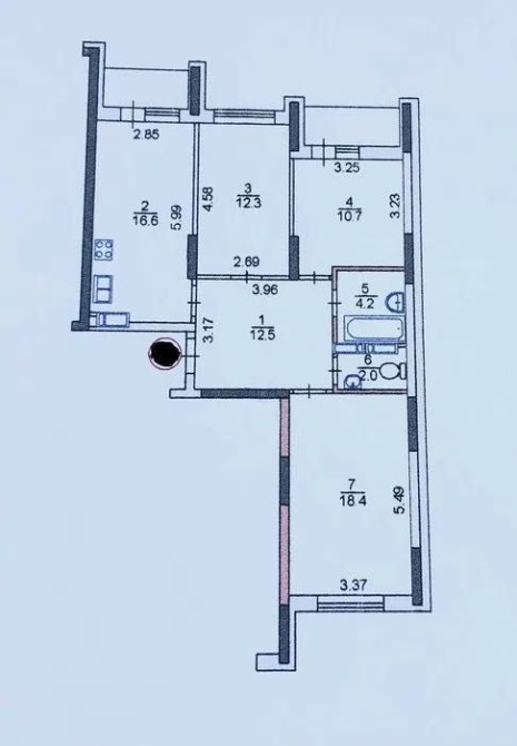 • Житлова площа: 41,4 кв.м (три кімнати: 18,4 + 12,3 + 10,7 кв.м)