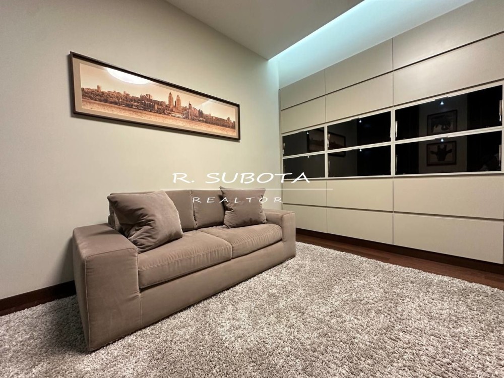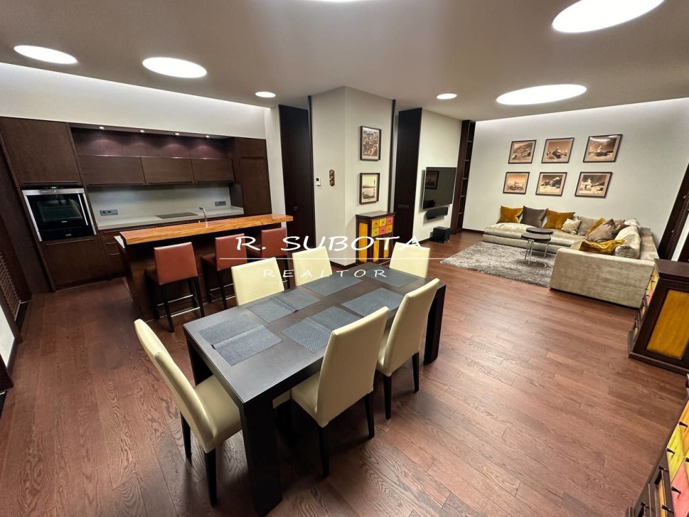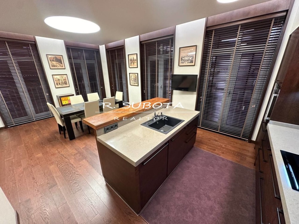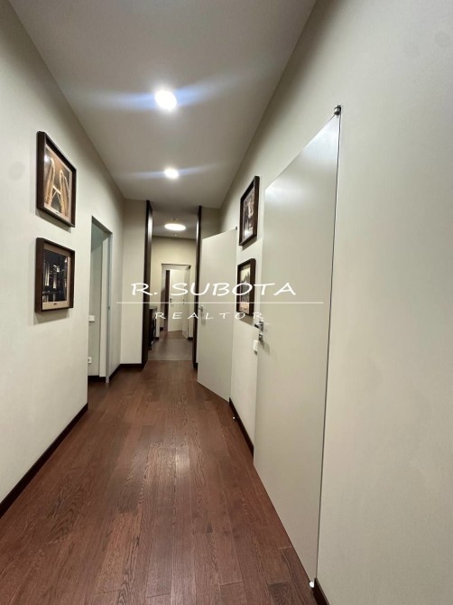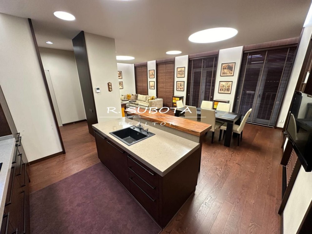 Квартира общей площадью 140 м2 спланирована: кухня-гостиная с видом на набережную Днепра, две отдельные спальни, две просторных ванны, два гардероба и балкон.