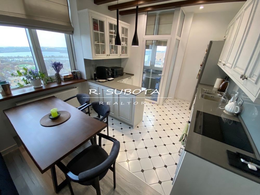 Квартира общей площадью 92м2 спланирована: кухня-студия, два с/у, две отдельных комнаты с панорамным видом на р. Днепр , гардероб и балкон.