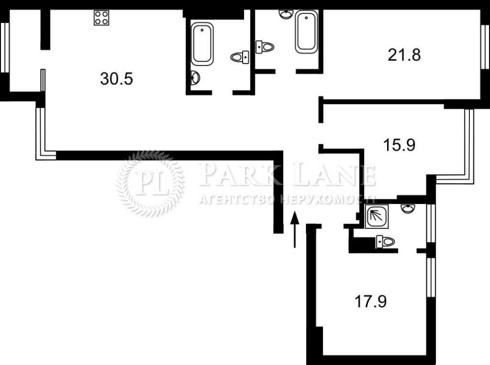 Три окремі кімнати, простора кухня-вітальня 30кв.м. з виходом на невеличку терасу, 3 санвузли (один з вікном).
