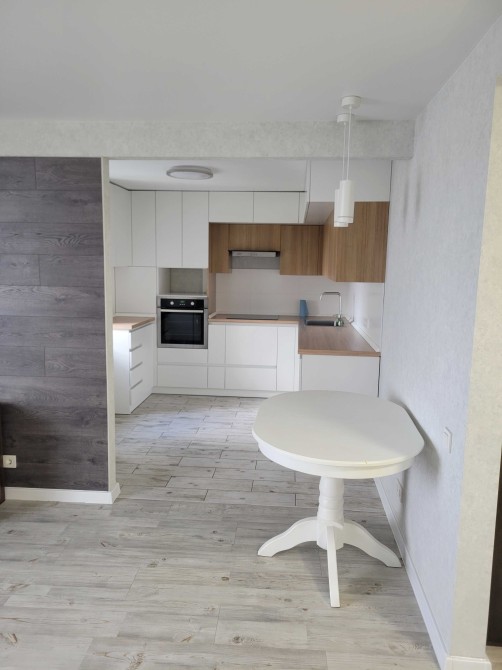 Кухня. Підлога із керамічної плитки із функцією електричного підігріву. Регулятор керування програмується та має звʼязок із WiFi для керування на відстані. На кухні інстальовано дорогі меблі із фурнітурою Blum. Є стіл виготовлений із дерева із 4-ма деревʼяними стільцями. Вмонтована посудомийка Bosh, індукційна плита, витяжка, та є місце для встановлення пральної машини. Є холодильник.