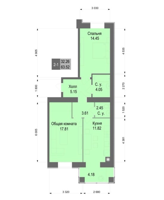 Загальна площа - 45 кв.м., житлова - 30 кв.м., кухня - 6 кв.м.