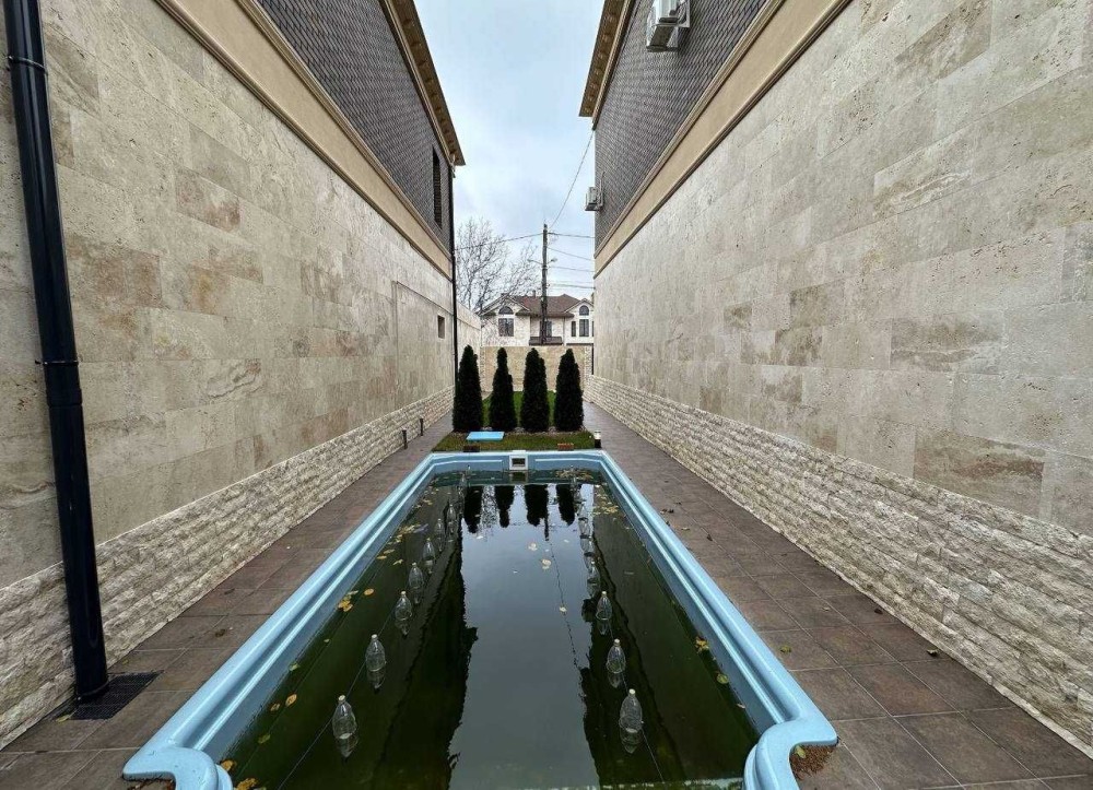 Материал постройки: красный кирпич, облицовка - травертин.