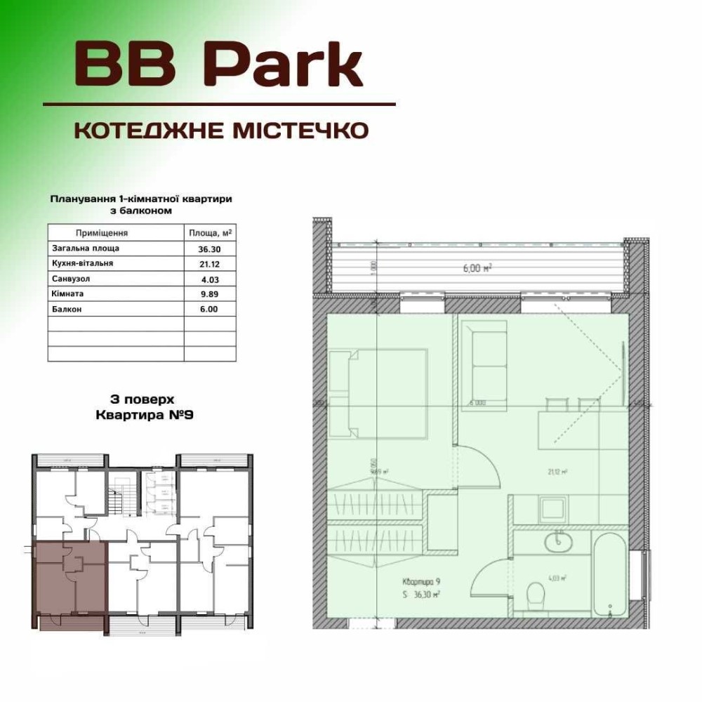 • Загальна площа: 36,30 м²