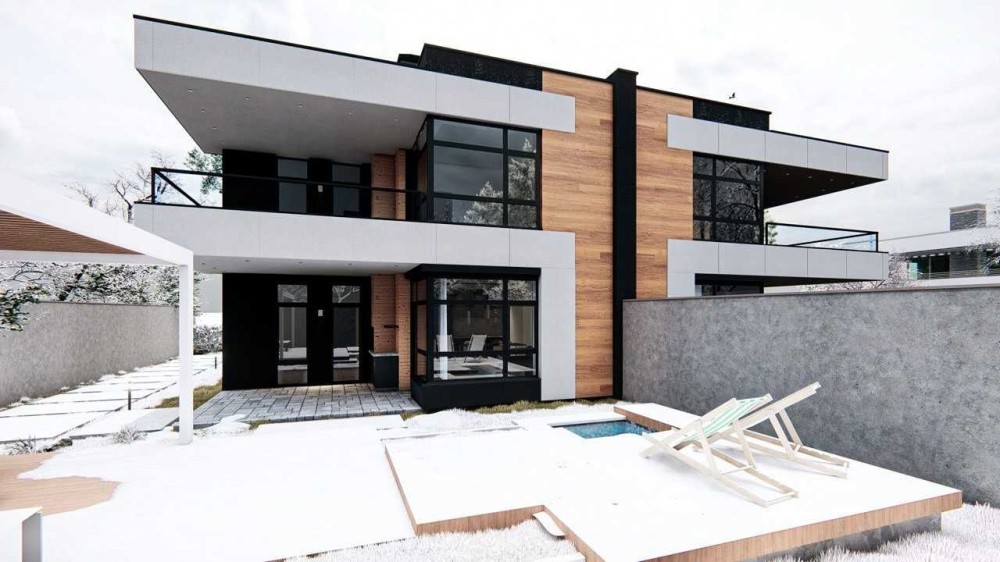 Сучасні архітектурні рішення в стилі Хай-тек. Дуплекс побудований з червоної керамічної цегли, утеплений та оздоблений натуральним каменем травертином.