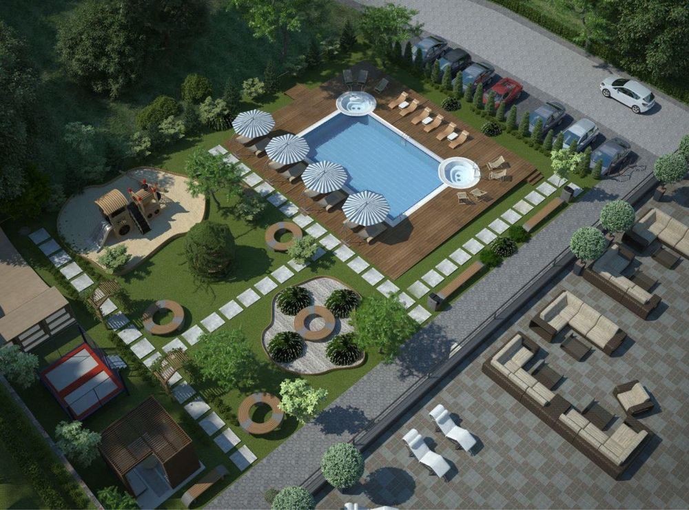 Сучасні апартаменти площею від 86 до 130 квадратних метрів з власною терасою та паркомісцем.
