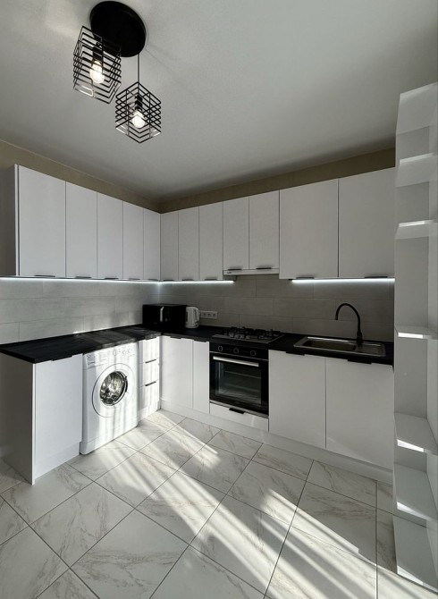 З техніки є: холодильник, варочна поверхня, духова шафа, пральна машинка, телевізор Smart, кондиціонер, мікрохвильова піч, чайник електричний,