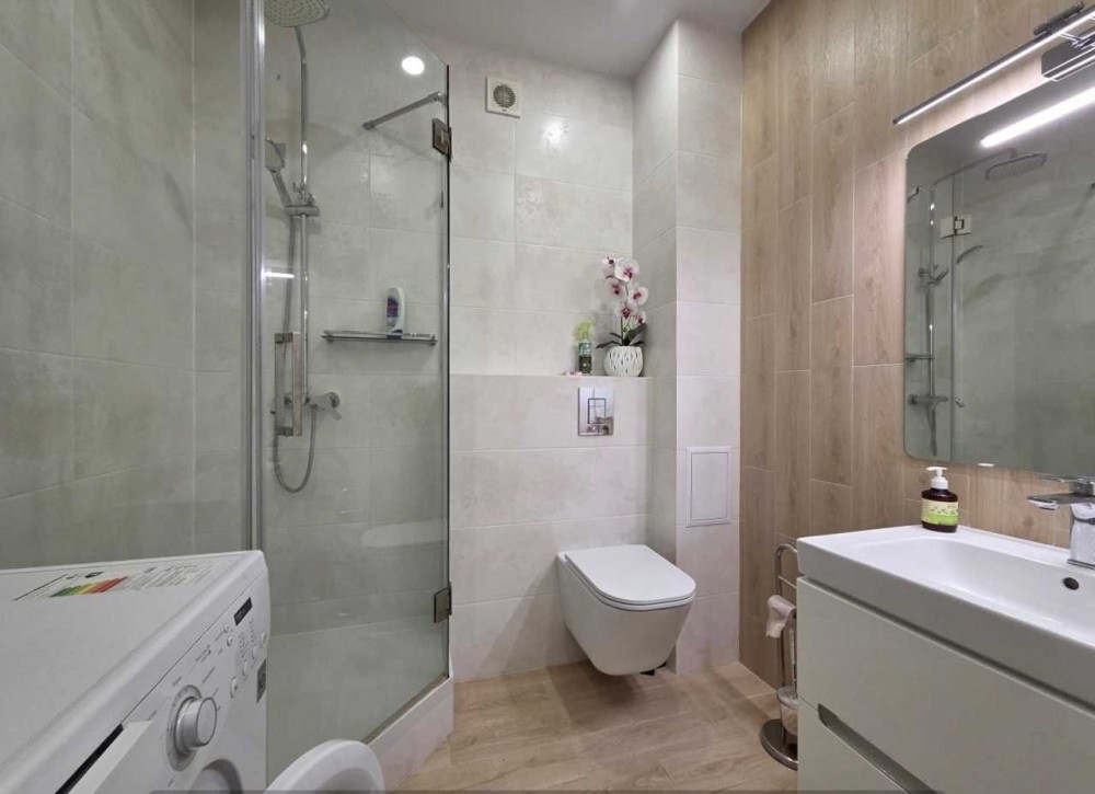 Санузел: Совмещенный, с душевой кабиной, инсталляцией, подвесной тумбой с раковиной и стиральной машиной.