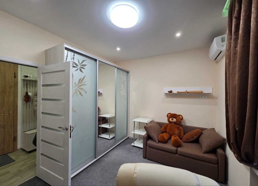 Гостиная/Кабинет: Оборудована удобным рабочим местом (письменный стол, кресло), небольшим диваном для отдыха и вместительным шкафом-купе с зеркальными дверями. Бонус – шведская стенка для поддержания формы. Установлен кондиционер.