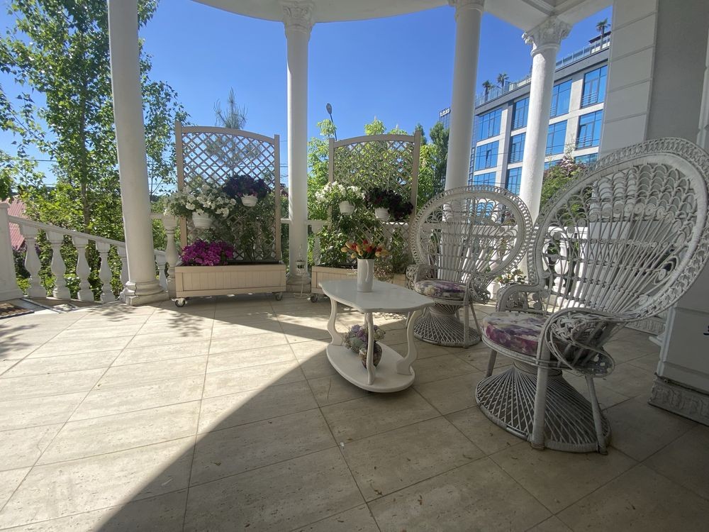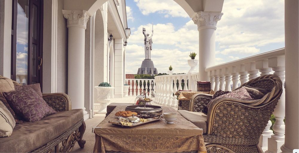 2 террасы (одна выполнена в восточном стиле, там же находится кальянная (вид на Родину Мать и реку Днепр), вторая – это зона барбекю, с которой открывается вид на внутренний дворик).