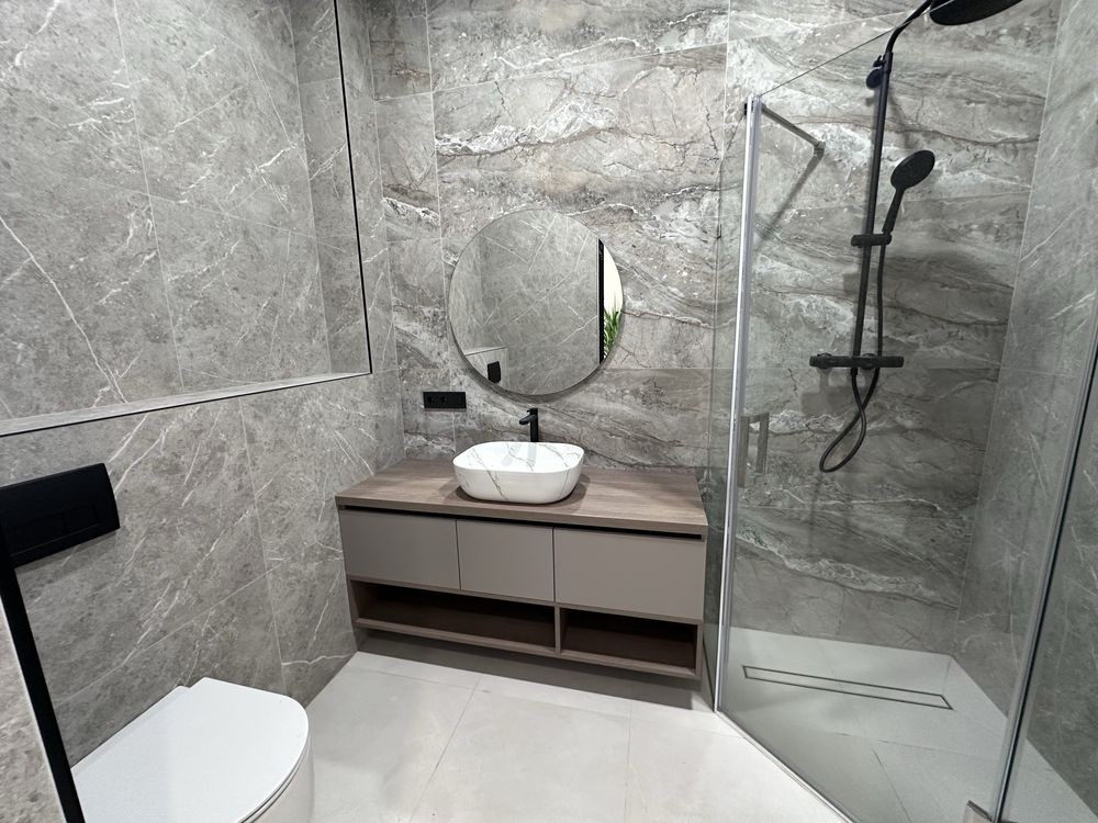 135 м2 , 3 спальні, 2 санвузли, гардеробні. Велика кухня-зала.