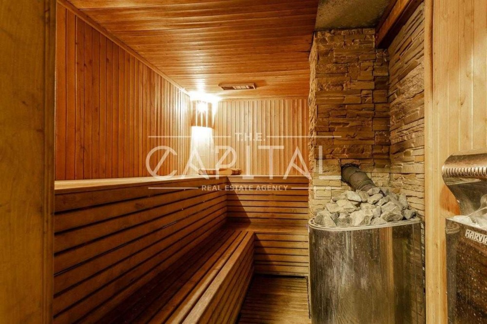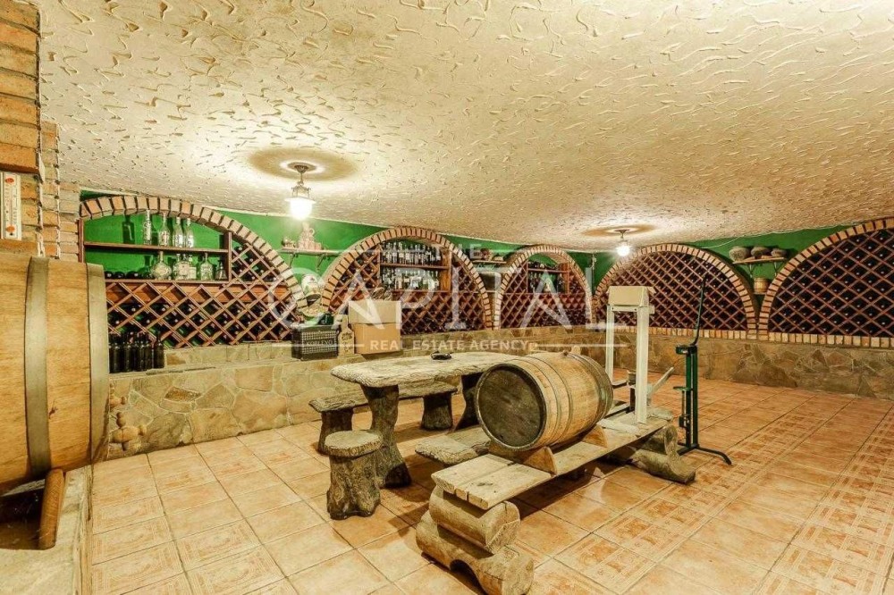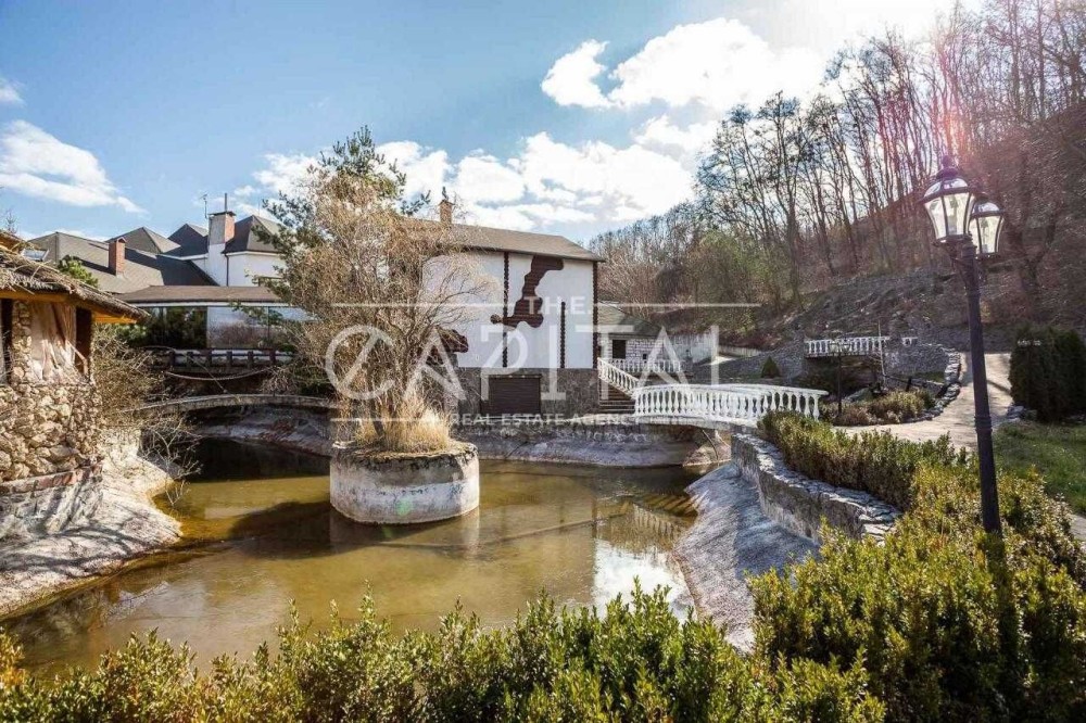 Общая площадь участка 1 га. На территории расположен шикарный бассейн, в котором установлен домашний кинотеатр, сауна, летняя кухня, дом для управления, домик для охраны, винный погреб и гараж на 2 машины.