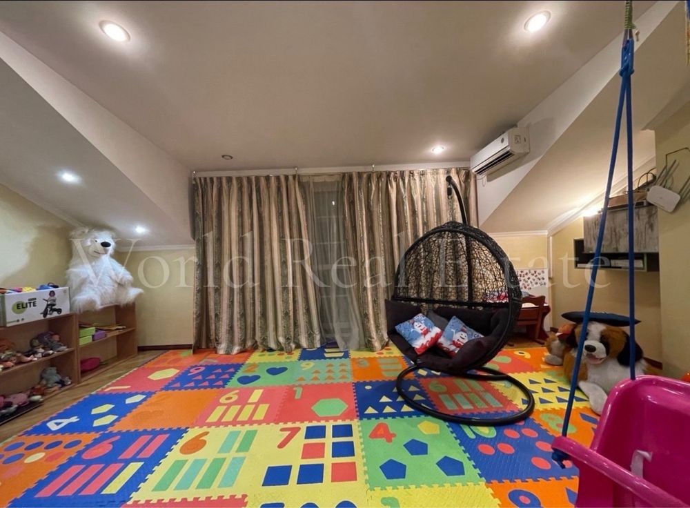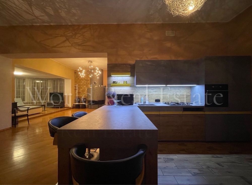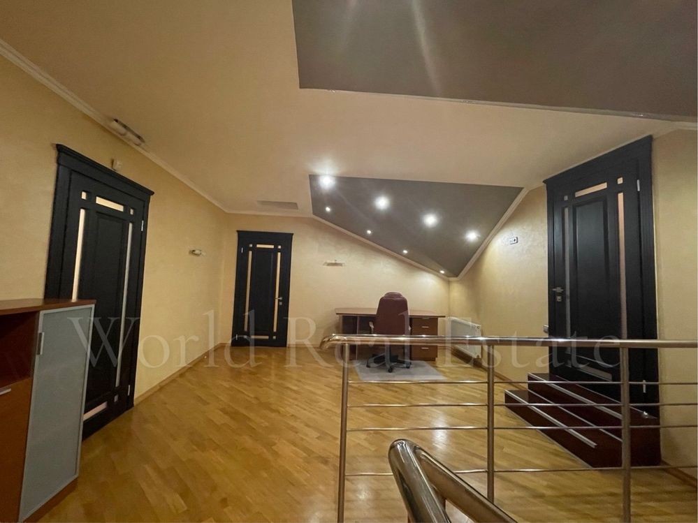 Площа будинку 370 м², 2 поверхи, 6 кімнат. Ділянка 20 соток. Будинок має два виходи: парадний — з фасадного боку, і другий — у двір, витонченими сходами, що ведуть з просторої тераси, що потопає в зелені. Будинок з авторським дизайном, облаштований всією необхідною технікою: вода у централізована супутникове ТБ, інтернет, система відеоспостереження, пультова охорона, підведено газ, котел, кондиціювання, вентиляція в гаражі, басейні та вбиральні, тепла підлога, генератор.