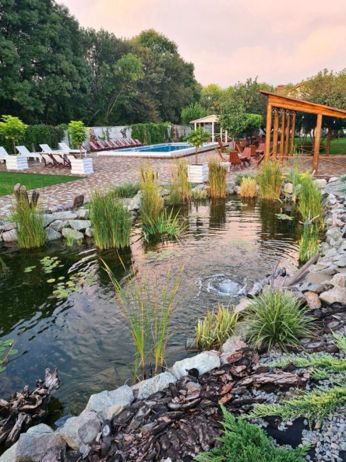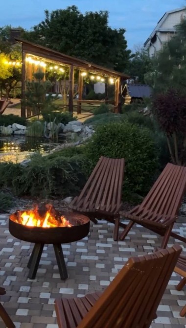 Входить: будинок (до 17 гостей з ночiвлею), мангальна зона, Банкетний зал (до 40 гостей), посуд, вогнище, садові меблі, басейн та альтанки по сезону.