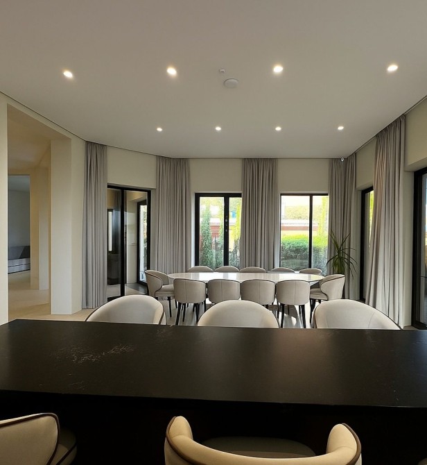 Просторная гостиная и обеденная зона с барной стойкой
