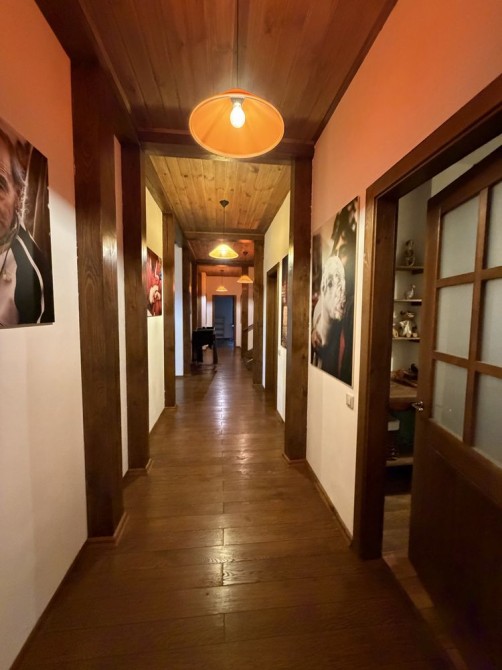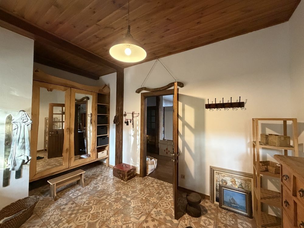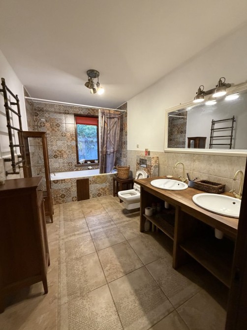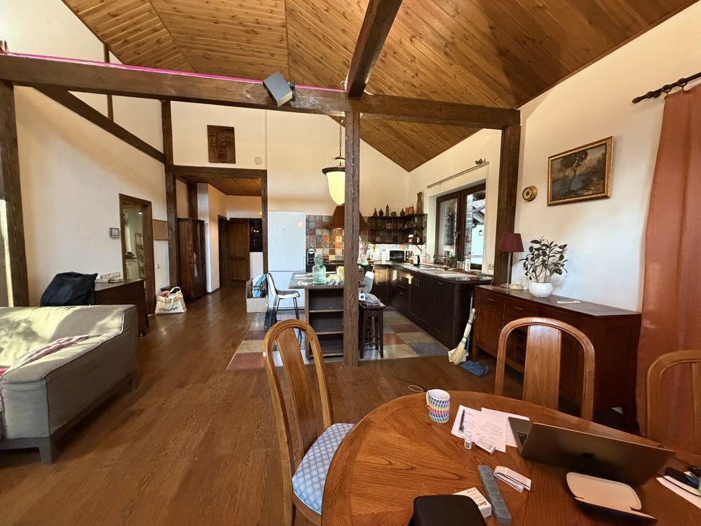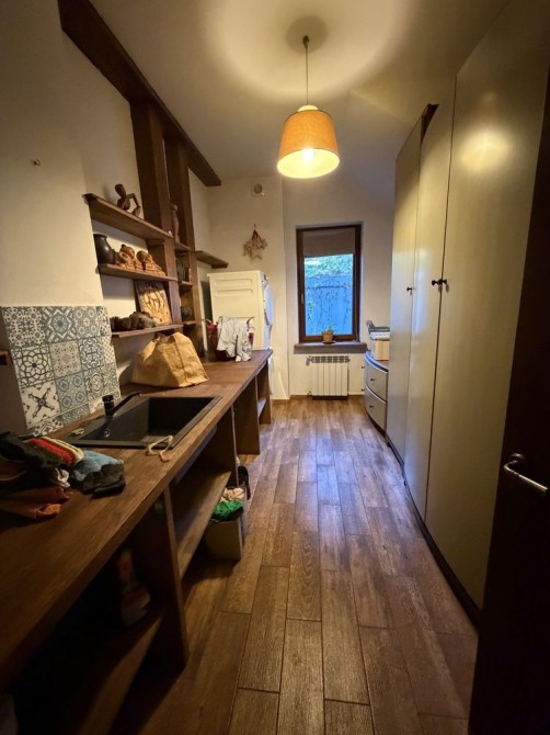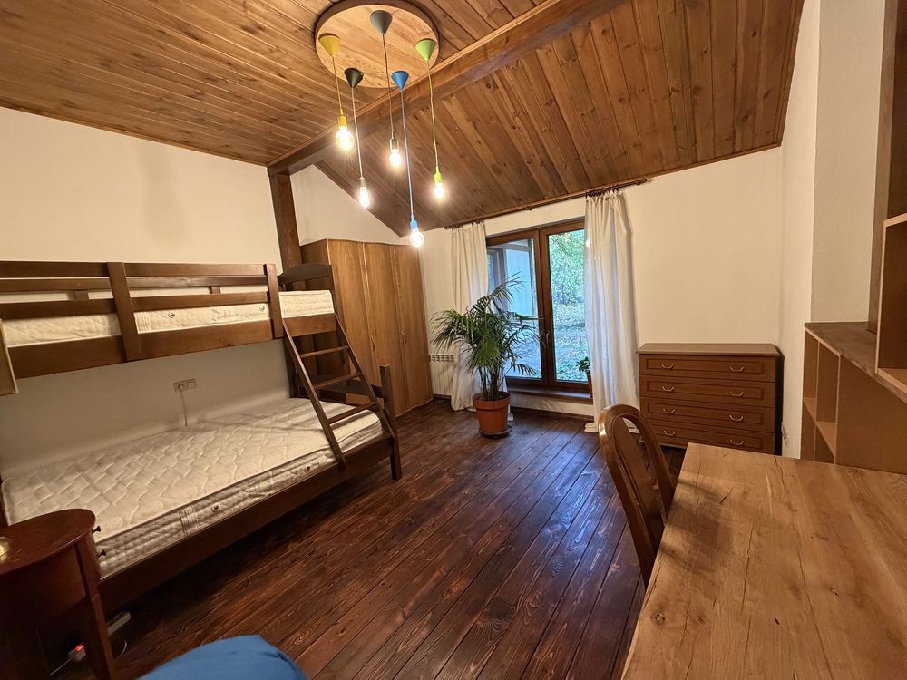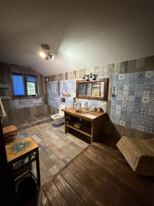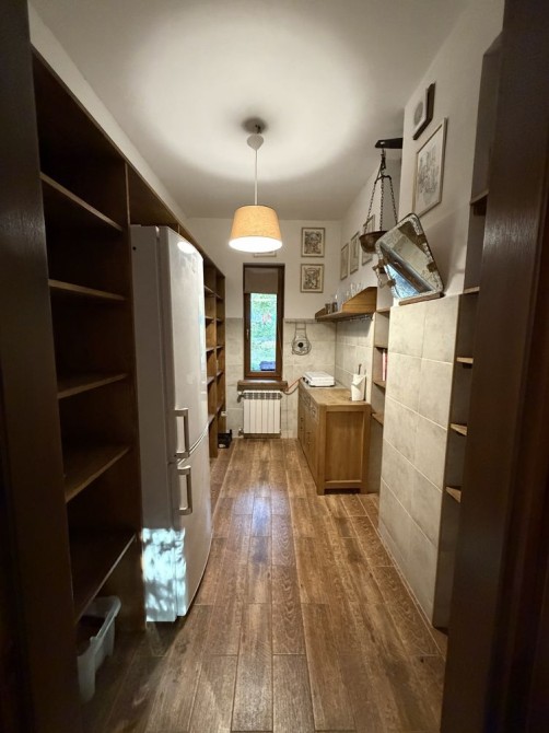 В доме на 1 эт: большая прихожая с теплым полом. В центре дома большая гостиная, объединяющая шикарную кухню, столовая с выходом на террасу и зону отдыха. Просторная светлая кухня плавно перетекает в обеденную зону, формируя единое гармоничное пространство. Далее пространство открывается в гостиную – уютную зону отдыха с диваном, большим OLED-телевизором с акустической системой и брутальным камином в стиле rustik, который при необходимости может служить дополнительным отоплением дома. Также на первом этаже: детская комната с двухъярусной кроватью, 2 спальни с шикарным видом на природу и кабинет. Имеются хозяйственная комната-кладовая вблизи кухни, большая постирочная, котельная, комната для животным с собственным выходом во двор. Имеется два санузла с душем и изысканной ванной.