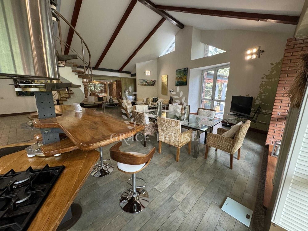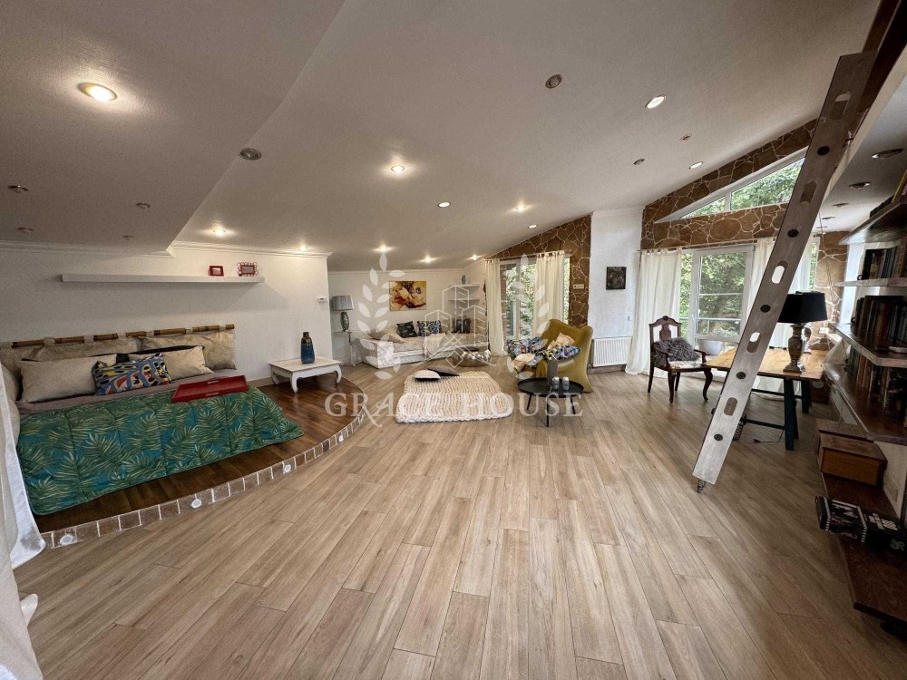 На первом этаже расположены просторная кухня-столовая, гостиная с камином, гостевая спальня с с/у, выход на террасу. А также отдельная спа-зона с бассейном с противотоком и сауной, кладовая, гардеробная. Второй свет, дизайнеркий ремонт в эстетическом стиле.