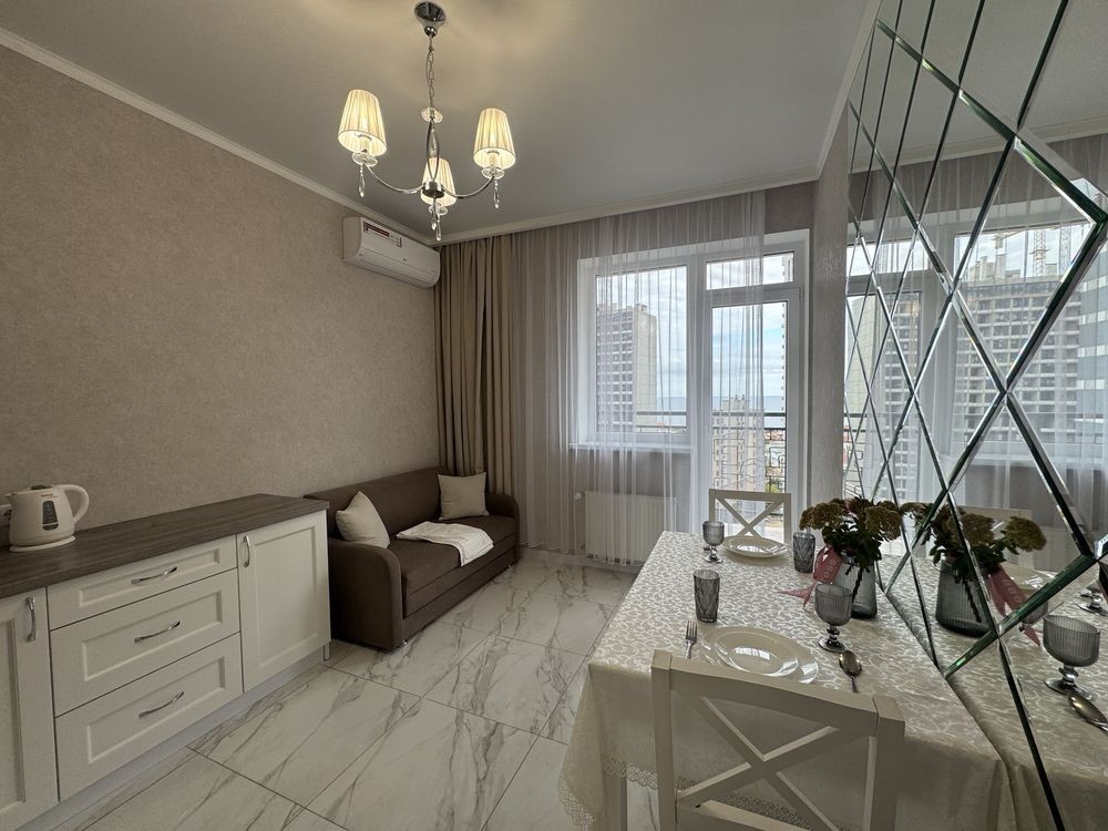 Оренда стильної 1 к кв з кухнею студією в новому будинку ЖК "Файна Таун" в Шевченківському районі, вул. Салютна, 2 Квартира 43 м2 , розташована на четвертому поверсі та складається з передпокою, спальні, великої кухні -студії та санвузла. Вікна квартири виходять в двір. Облаштована всіма необхідними меблями з екологічно чистої деревини та оснащена побутовою технікою: телевізор Samsung Smart 43, кондиціонери в кухні та кімнаті, плита індукційна, вбудований холодильник, духова шафа з функцією мікрохвильової печі, пральна машина з сушаркою. В кухні та ванній кімнаті тепла підлога, високошвидкісний інтернет. ЖК "Файна Таун" це: закрита територія з входом по картці, цілодобова охорона, відеоспостереження, паркінг, підземні контейнери для сміття, зарядні станції для електромобілів та лавки з інтегрованими батареями для підзарядки девайсів, розумне освітлення, яке підлаштовується під час доби та ще багато чого для того, щоб жити з комфортом й ні в чому себе не обмежувати) розповім при перегляді. Зручне транспортне сполучення та розвинута інфраструктура: магазини,спортивні та пішохідні зони ,зона барбекю, ресторани та кафе. Квартира, в якій поєднані комфорт та затишок, шукає своїх порядних орендарів молоду пару або одну людину без дітей та тварин. Перша оренда, квартира вільна.