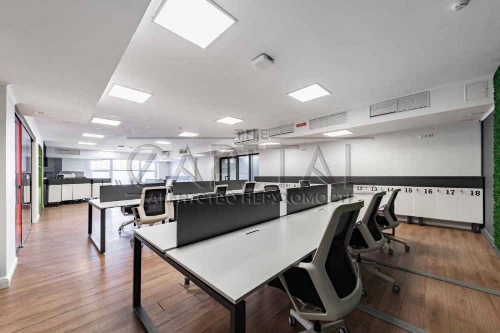 Рецепція, кухня, переговорна кімната, два кабінети, open-space, 3 санвузла, душова кабіна, серверна/господарська кімната.