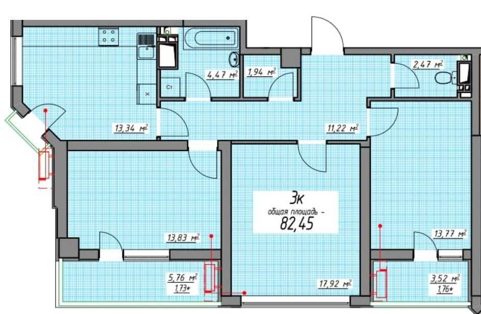 Функциональная планировка: три просторные раздельные комнаты, одна из которых с французским балконом, большая кухня-столовая, два санузла, гардеробная, балкон и лоджия.
