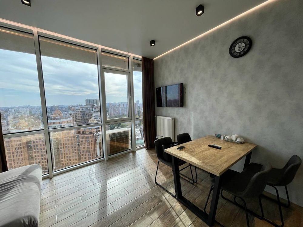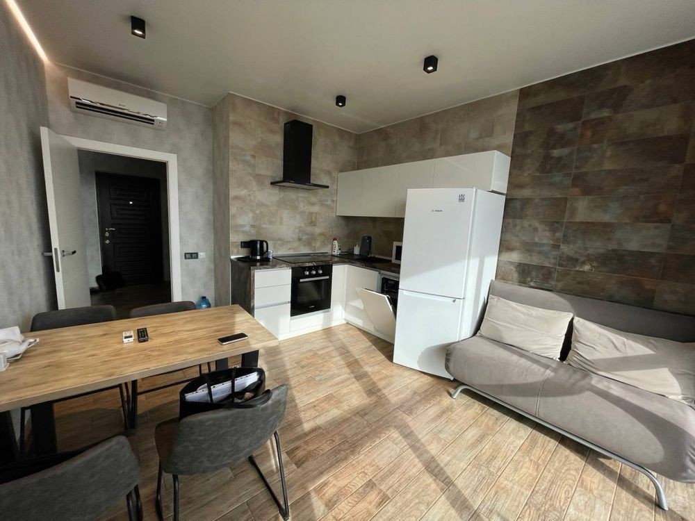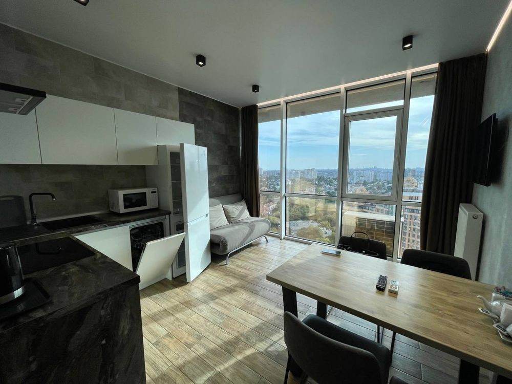 Оренда стильної 1 к кв з кухнею студією в новому будинку ЖК "Файна Таун" в Шевченківському районі, вул. Салютна, 2 Квартира 43 м2 , розташована на четвертому поверсі та складається з передпокою, спальні, великої кухні -студії та санвузла. Вікна квартири виходять в двір. Облаштована всіма необхідними меблями з екологічно чистої деревини та оснащена побутовою технікою: телевізор Samsung Smart 43, кондиціонери в кухні та кімнаті, плита індукційна, вбудований холодильник, духова шафа з функцією мікрохвильової печі, пральна машина з сушаркою. В кухні та ванній кімнаті тепла підлога, високошвидкісний інтернет. ЖК "Файна Таун" це: закрита територія з входом по картці, цілодобова охорона, відеоспостереження, паркінг, підземні контейнери для сміття, зарядні станції для електромобілів та лавки з інтегрованими батареями для підзарядки девайсів, розумне освітлення, яке підлаштовується під час доби та ще багато чого для того, щоб жити з комфортом й ні в чому себе не обмежувати) розповім при перегляді. Зручне транспортне сполучення та розвинута інфраструктура: магазини,спортивні та пішохідні зони ,зона барбекю, ресторани та кафе. Квартира, в якій поєднані комфорт та затишок, шукає своїх порядних орендарів молоду пару або одну людину без дітей та тварин. Перша оренда, квартира вільна.