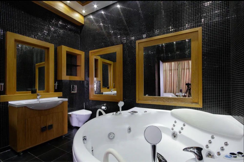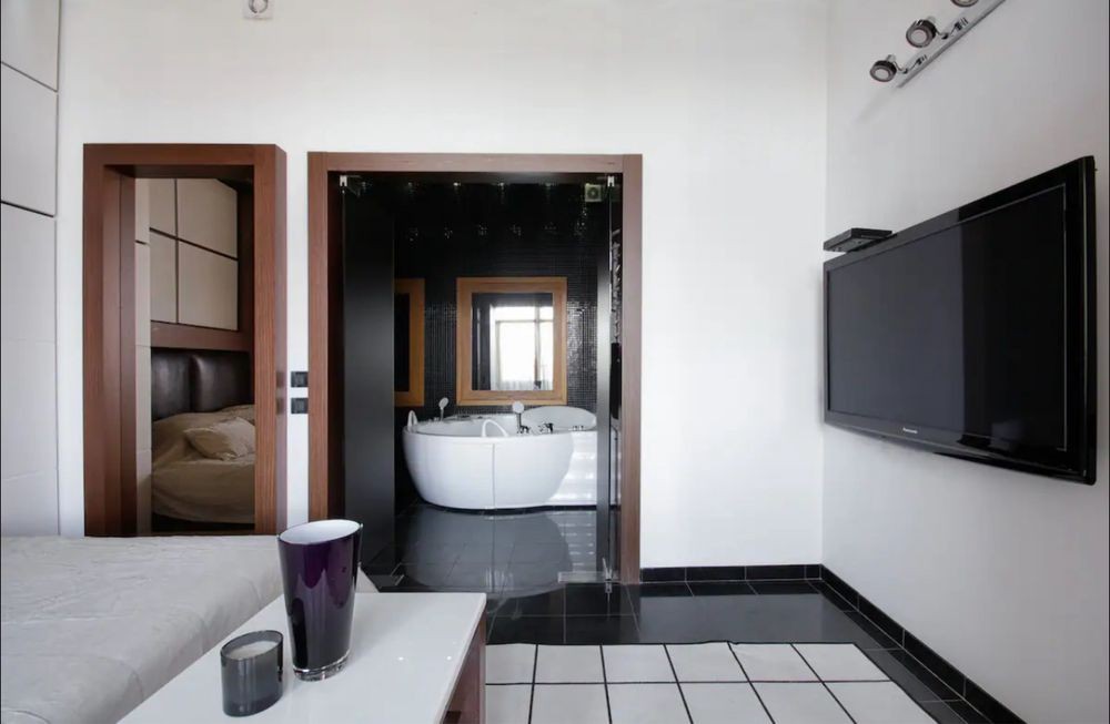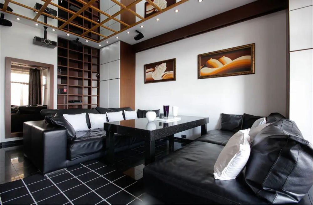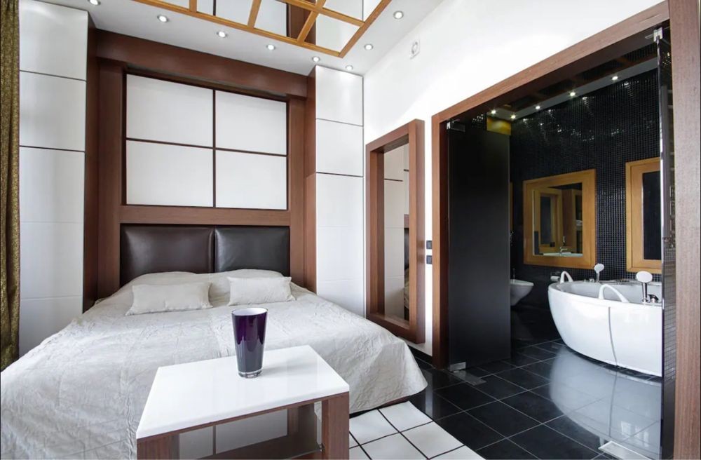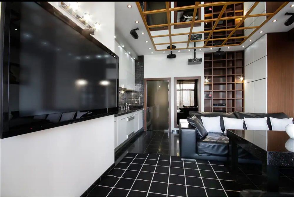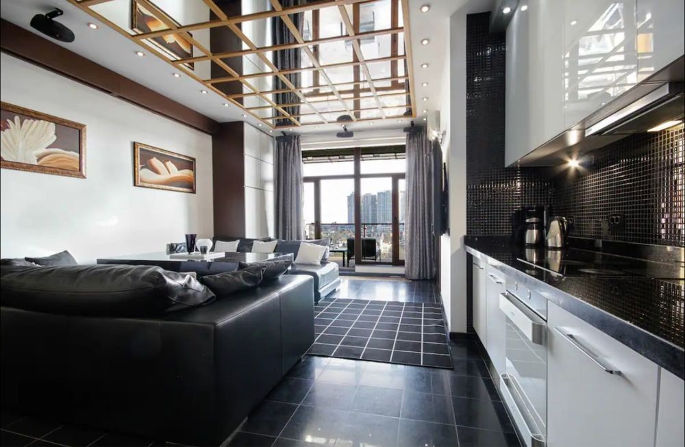 Стильная просторная квартира с дорогой техникой, аппаратурой, хорошей мебелью! Большая студия с зоной отдыха и встроенной кухней, полноценная спальня с с/у с большой джакузи, с/у с душем.