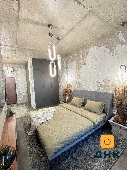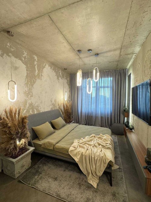 • Потолки и стены с бетонной фактурой, стильное освещение, уютная спальня