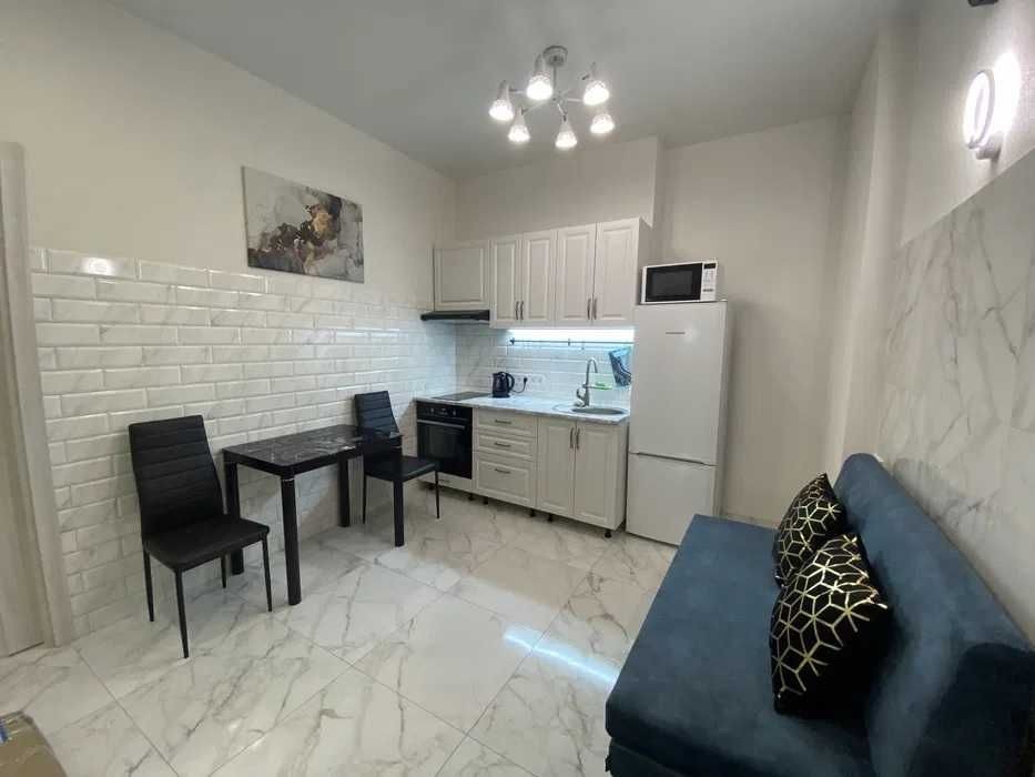 Оренда стильної 1 к кв з кухнею студією в новому будинку ЖК "Файна Таун" в Шевченківському районі, вул. Салютна, 2 Квартира 43 м2 , розташована на четвертому поверсі та складається з передпокою, спальні, великої кухні -студії та санвузла. Вікна квартири виходять в двір. Облаштована всіма необхідними меблями з екологічно чистої деревини та оснащена побутовою технікою: телевізор Samsung Smart 43, кондиціонери в кухні та кімнаті, плита індукційна, вбудований холодильник, духова шафа з функцією мікрохвильової печі, пральна машина з сушаркою. В кухні та ванній кімнаті тепла підлога, високошвидкісний інтернет. ЖК "Файна Таун" це: закрита територія з входом по картці, цілодобова охорона, відеоспостереження, паркінг, підземні контейнери для сміття, зарядні станції для електромобілів та лавки з інтегрованими батареями для підзарядки девайсів, розумне освітлення, яке підлаштовується під час доби та ще багато чого для того, щоб жити з комфортом й ні в чому себе не обмежувати) розповім при перегляді. Зручне транспортне сполучення та розвинута інфраструктура: магазини,спортивні та пішохідні зони ,зона барбекю, ресторани та кафе. Квартира, в якій поєднані комфорт та затишок, шукає своїх порядних орендарів молоду пару або одну людину без дітей та тварин. Перша оренда, квартира вільна.